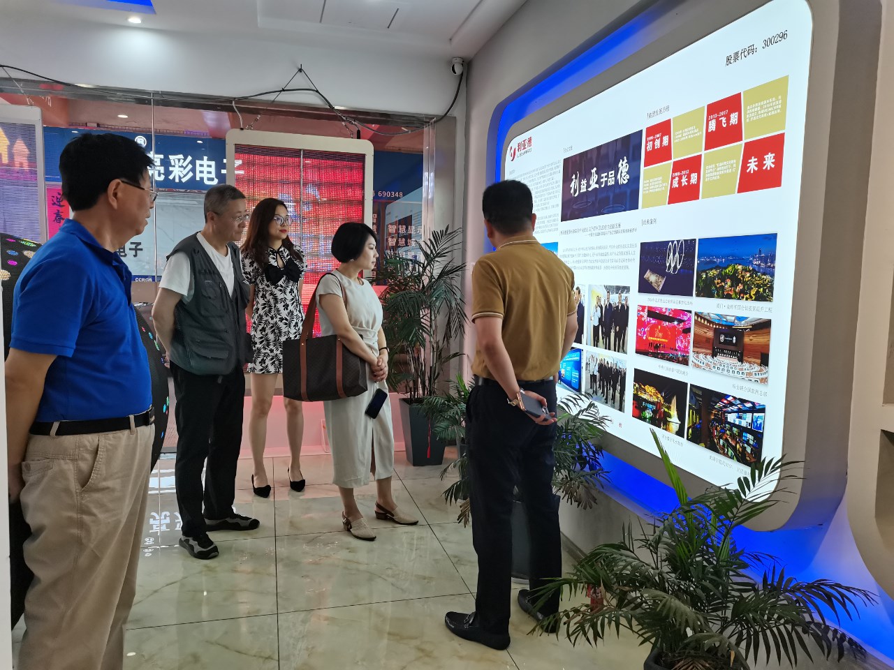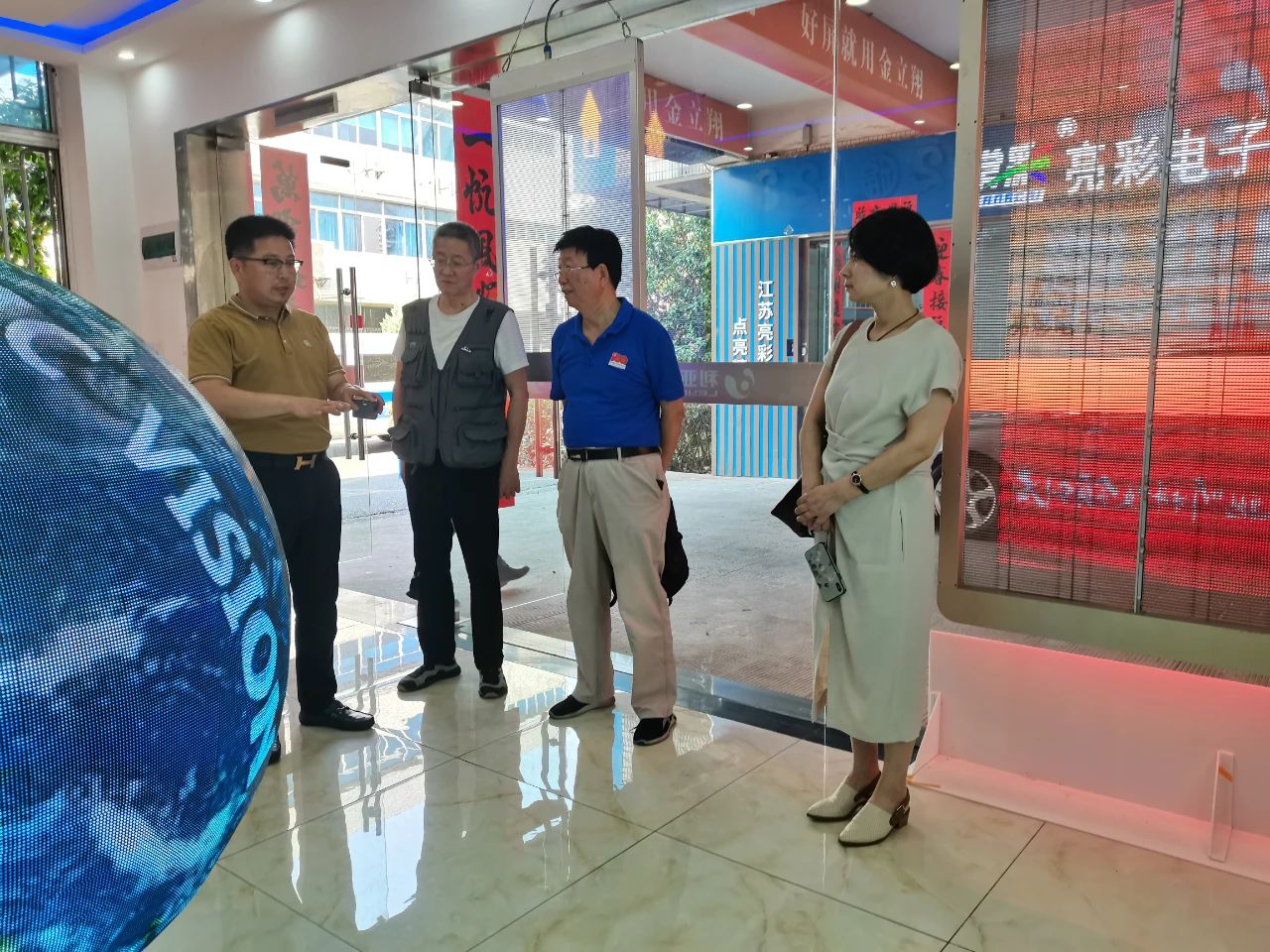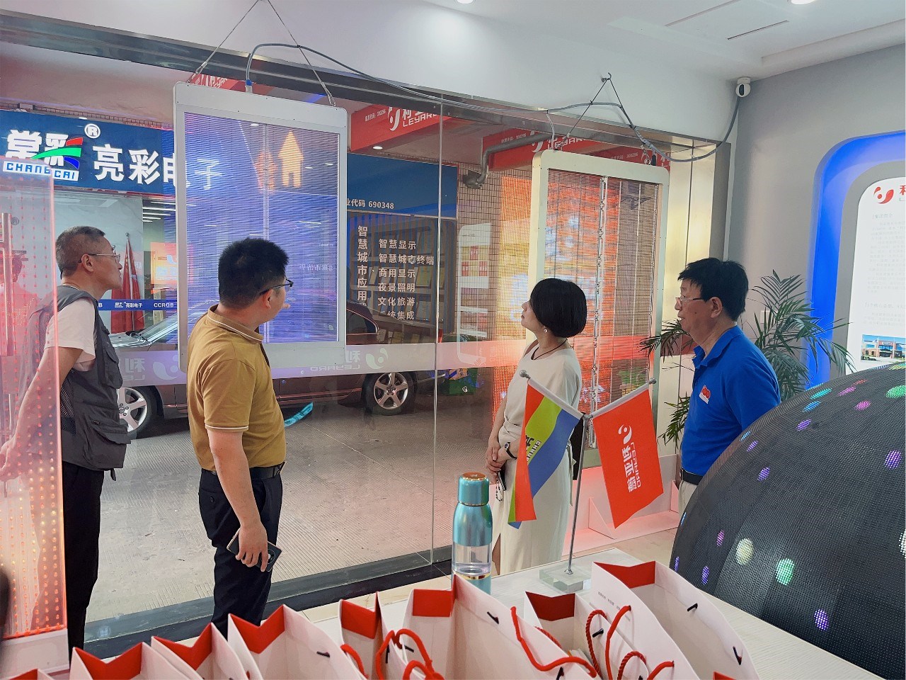 步入展厅,章总向各位领导介绍了LED显示特色产品,如135寸会议一体机、球形屏、地砖互动屏、3D屏等,包含多类不同的应用场景。