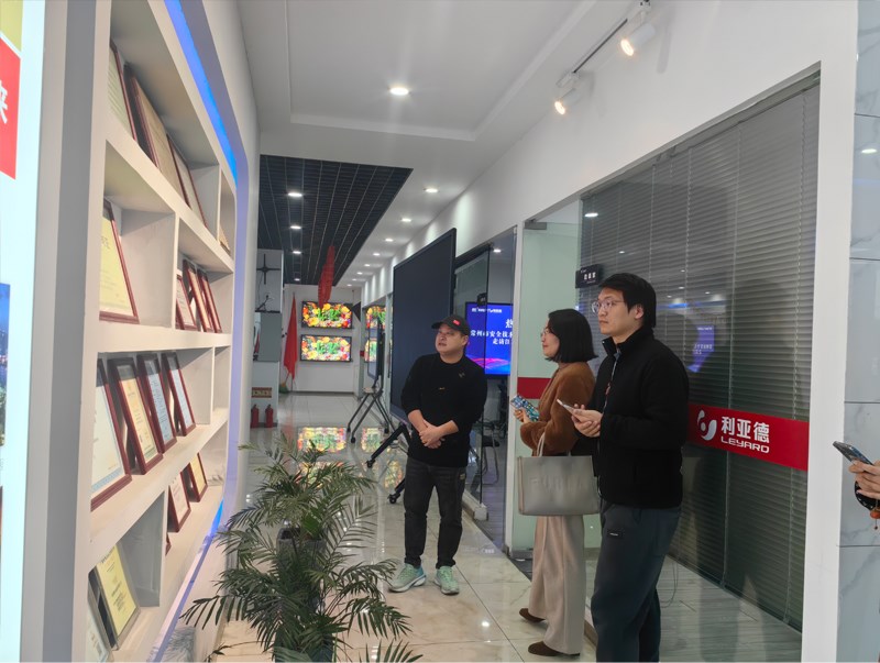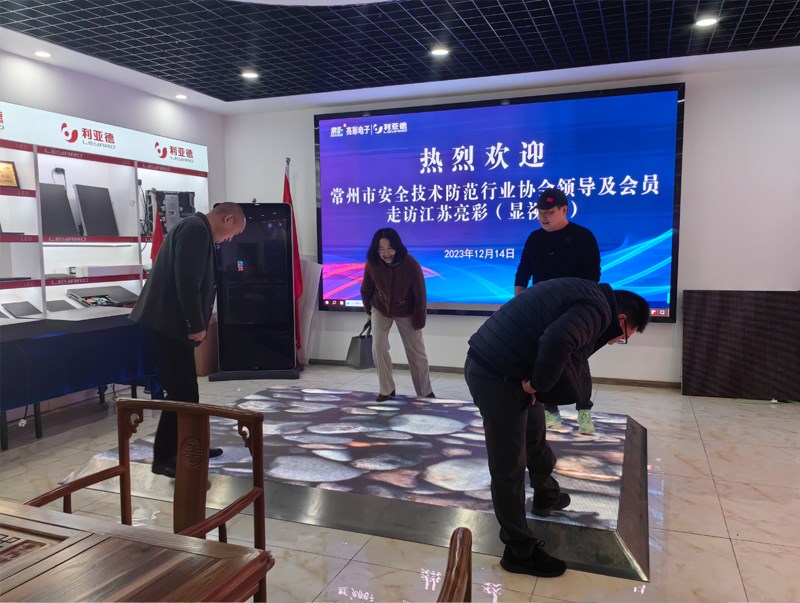 章总陪同到访代表参观了利亚德(江苏·常州)体验中心,介绍了智能化产品及资质证书,如LED/LCD会议一体机、球形屏、地砖互动屏、3D屏等,包含多类不同的应用场景。