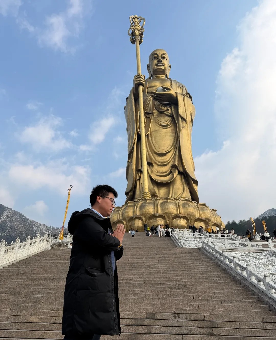 我们第一站就打卡了九华山大愿文化园。一踏进园区,庄严又治愈的氛围瞬间包裹全身,巨大的地藏菩萨圣像稳稳矗立在暖阳里,让人忍不住放慢脚步。