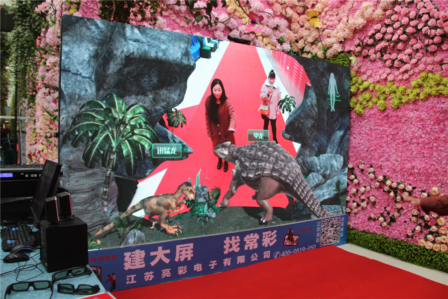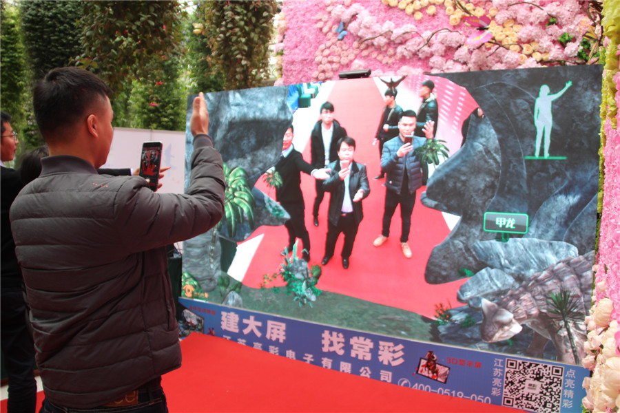 在会场的一侧入口处,江苏亮彩电子展示了时下最火的LED+3D+AR技术,通过大屏幕与人的互动,不少参会人员在一旁围观,也想体验一把。