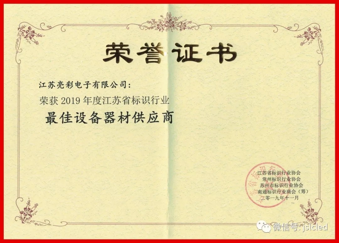 在这次盛会上,荣获"2019年度江苏省标识行业最佳设备供应商"。这是江苏亮彩公司的光荣,感谢协会对我司的认可,以此为今后工作更大的动力,更好地为协会和广大客户服务!