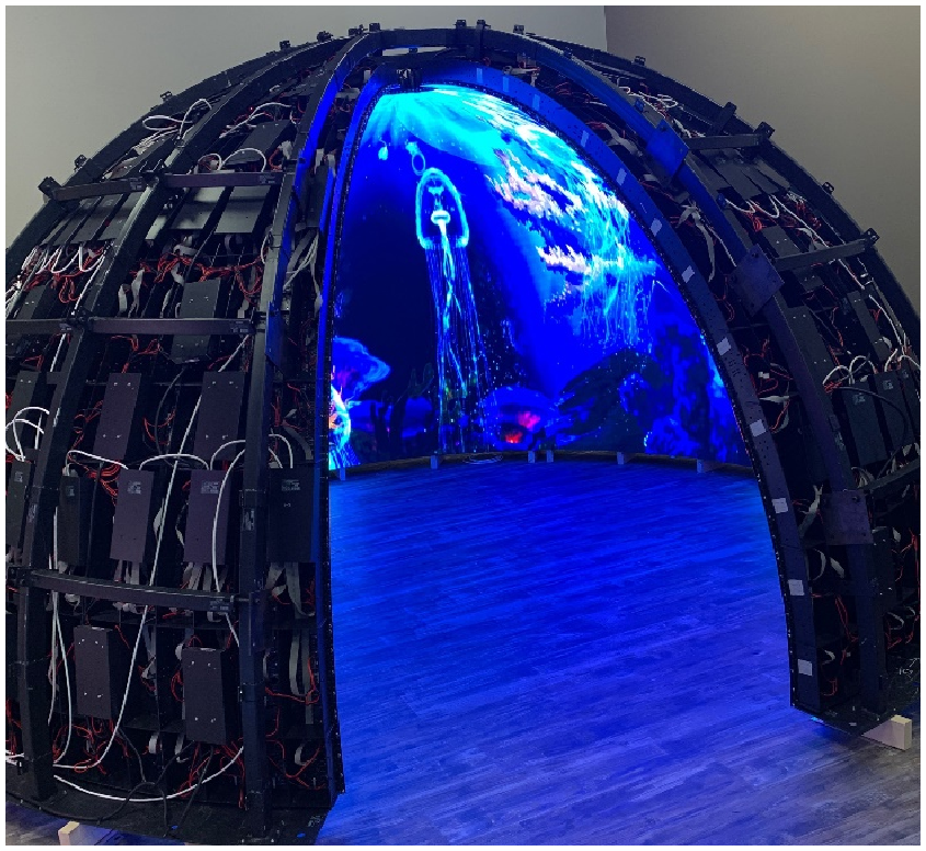 再结合模组磁柱+钢结构的高效率安装方式。通过丰富多样的钢结构设计,可将SV(soft)柔性模组根据需要拼接弧形屏,圆柱,曲面等等创意显示屏,打造显示多元化。